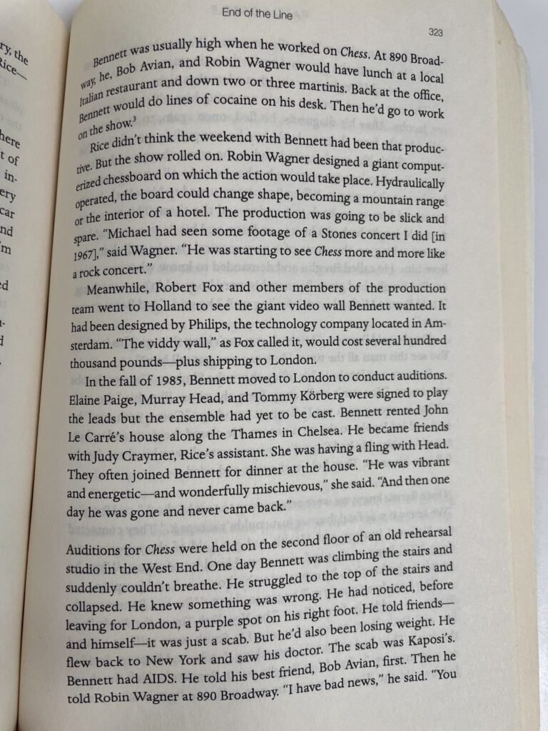 For more eye-opening details regarding the story behind the creation of Chess, I strongly suggest you read Chapter Twenty-Three, “End of the Line,” of Razzle Dazzle by Michael Riedel. Here is an excerpt detailing the struggles of Michael Bennett (April 1943 – July 1987):